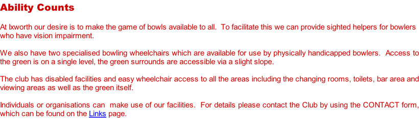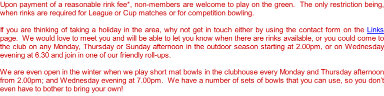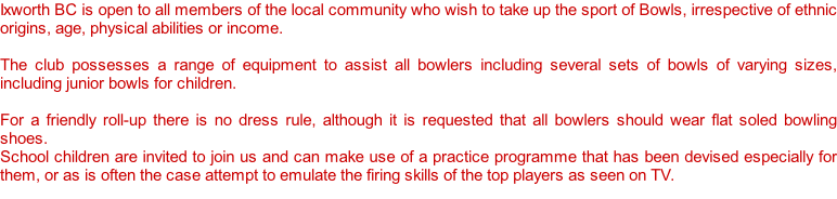 Bowls definitely is a game that all can play. There is no age restriction, no physical restriction and ALL play together. No longer able to play football? Gettting too slow for cricket or tennis? Golf too expensive? Then we have the answer. Contact us using the link on the Links page, or come along any Monday, Thursday or Sunday afternoon, or Wednesday evening.
