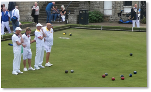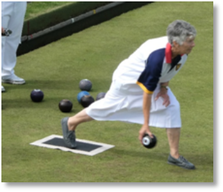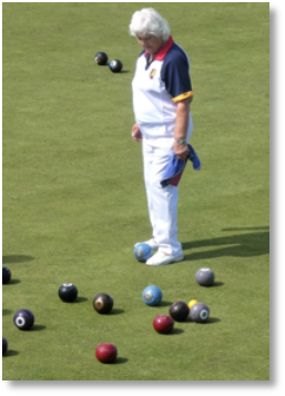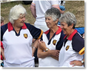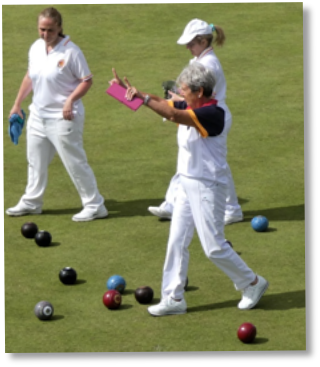 Clockwise from the left. A team talk before the Ladies Triples starts; Christine delivering a bowl; you were this short!; Assessing the head.